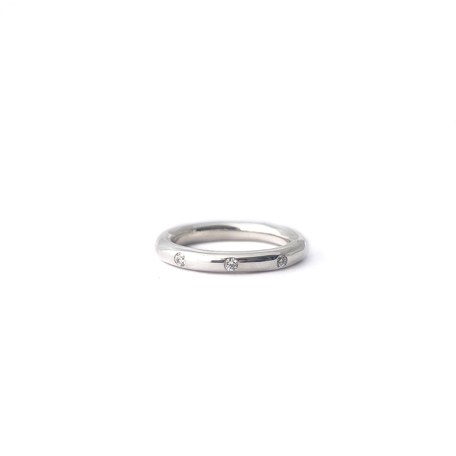 An incredibly soft, fully rounded band in solid sterling silver featuring 3 round brilliant diamonds. A perfect piece to celebrate a meaningful "3" in your life.