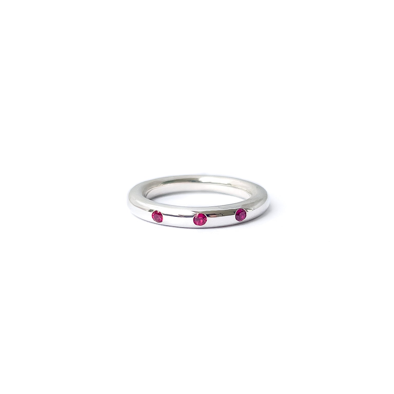 An incredibly soft, fully rounded band in solid sterling silver featuring 3 natural rubies. A perfect piece to celebrate a meaningful "3" in your life.